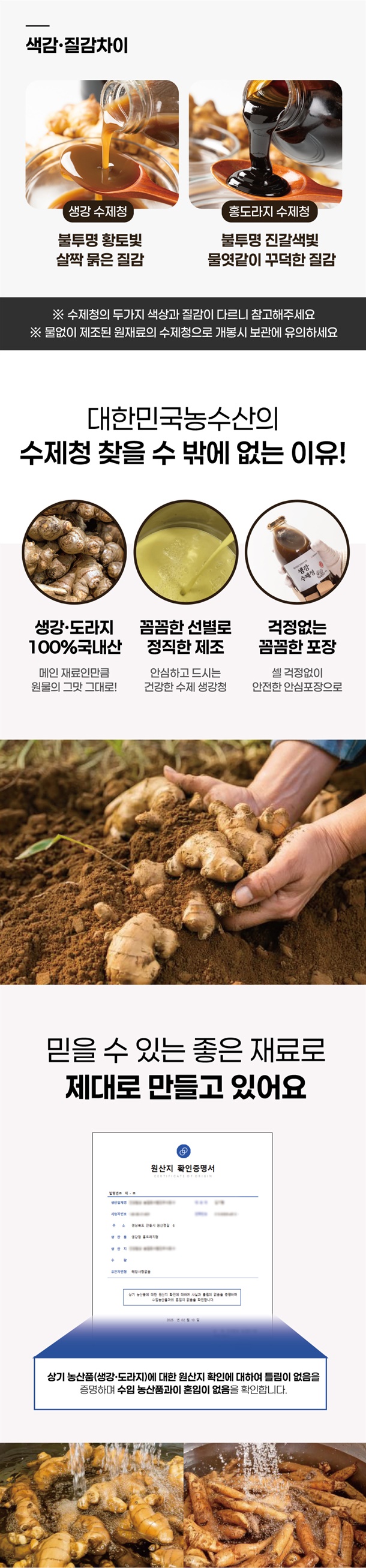 | 1-2. 생산자 및 소재지(수입품의 경우 생산자, 수입자 및 제조국) | 청하바이오(생강청),건강밥상(도라지청) |