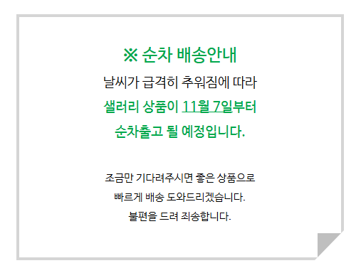 · 예약 발송 상품은 상 품 상세 설명에 안내한 배송관련 정보를 반드시 확인 후 구매해 주세요.